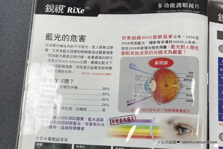 驗光人員推薦這款銳視Rixe多功能護眼鏡片,抗UV、濾藍光、奈米電鍍超潔淨,及非球面設計,影像不失真,鏡片更輕更薄。 現代人生活已經離不開3C產品,手機、電腦所發出的藍光接近紫外線,會對眼睛造成嚴重傷害,甚至引起黃斑部病變。 所以配濾藍光鏡片對眼睛比較好,阻隔藍光可減輕藍光對眼睛的傷害。